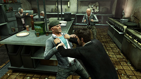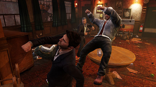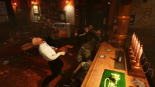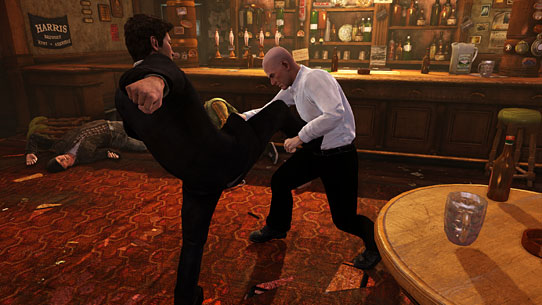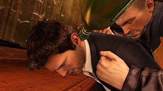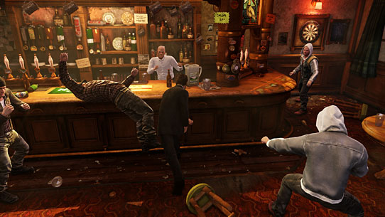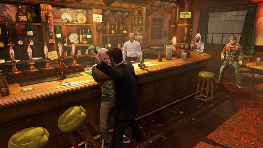 Drake counter-attacks the bartender; scripted to join the fray at just the right time.