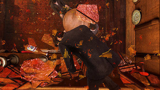 The bottles, glasses, and ashtrays knocked through this window are driven via scripted physics events.